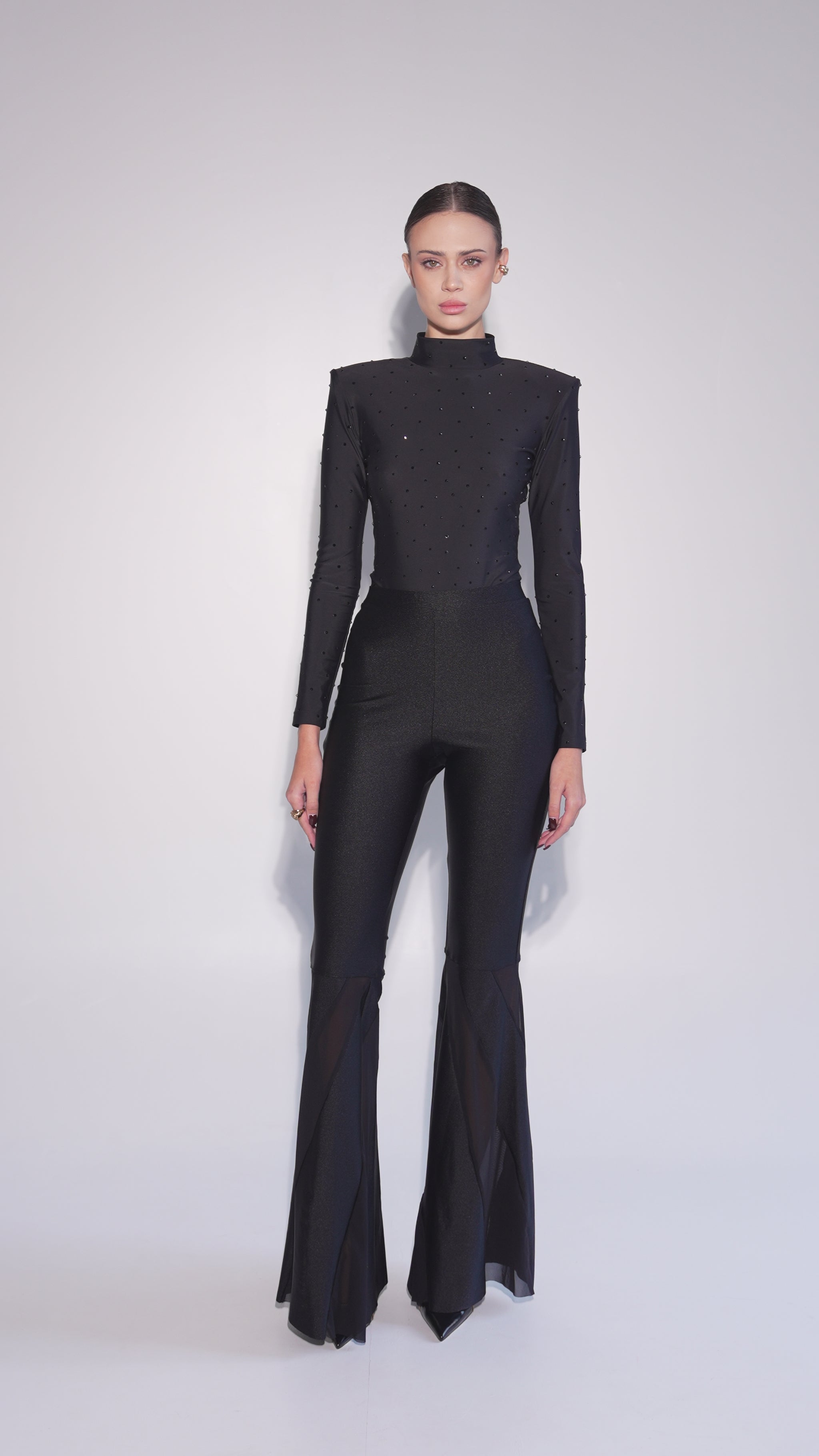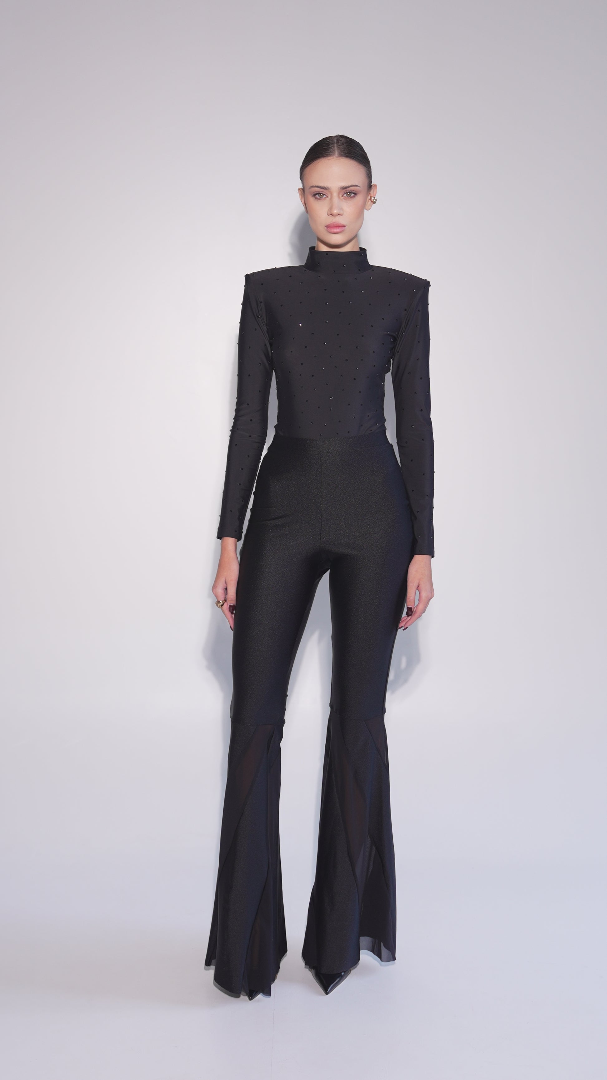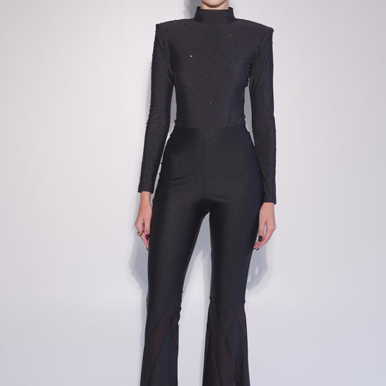 A luxurious and seductive black bodysuit completely covered in sparkling crystals. Long sleeves and a high neckline create an elegant silhouette. The bottom part is made of transparent fabric, adding a special touch of spice to the look.